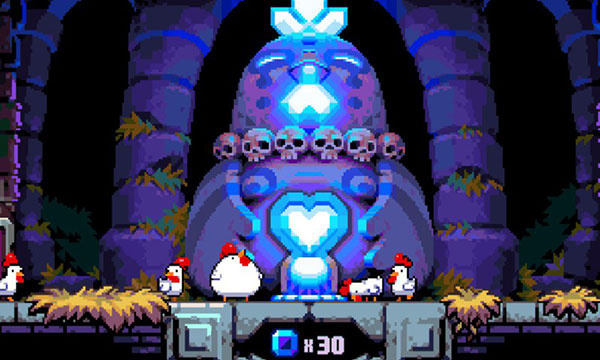 游戏画面展示了经典的像素风格场景,母鸡正在利用堆叠的炸弹探索高处。