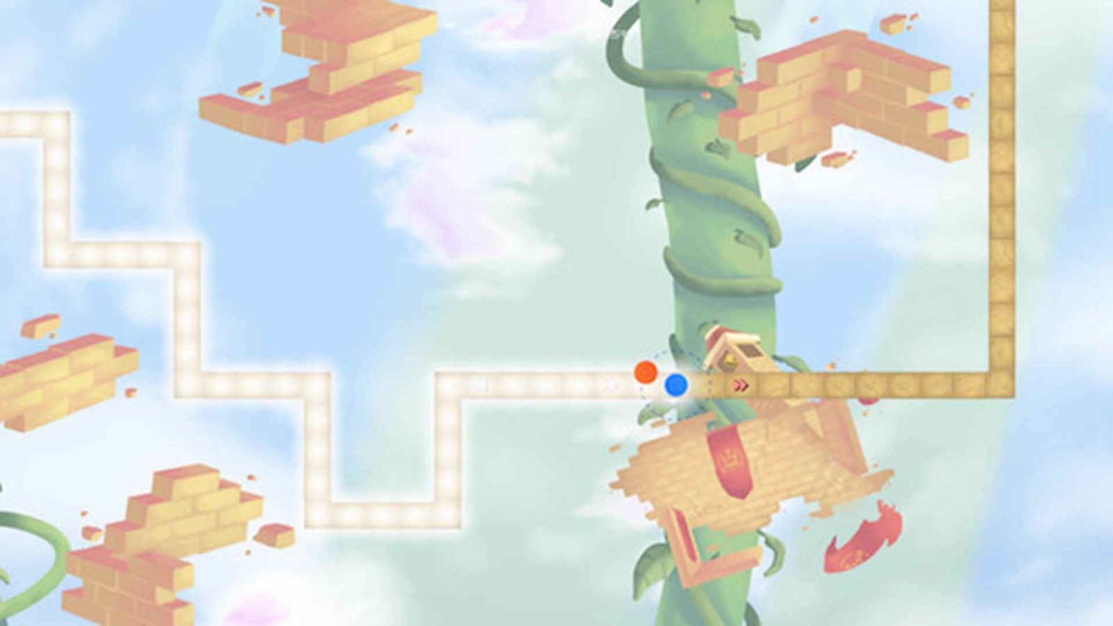 游戏画面展示了冰与火双星在绚丽轨道上同步前进的经典场景,视觉与节奏高度统一。