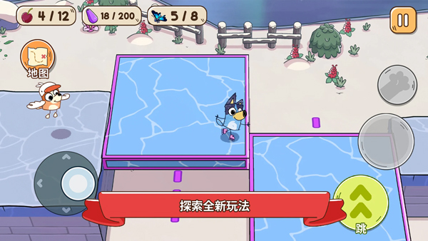 游戏采用经典的横版移动操作。左侧虚拟摇杆控制布鲁伊移动,右侧则有跳跃、互动等按键。