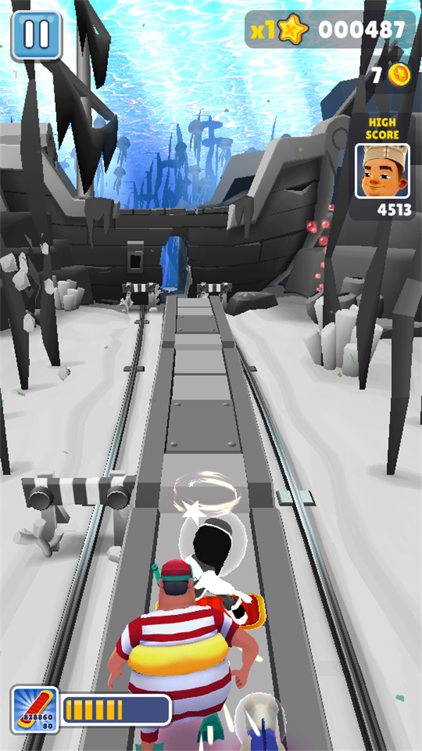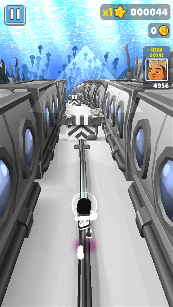 当你操控角色在轨道上飞驰时,会看到背景中悠然飘过的发光水母群、冒着串串气泡的珊瑚礁,以及身着彩色救生衣的警察——这抹唯一的亮色在黑白背景中格外醒目,既点明了水下主题,又增加了画面的戏剧张力。这种极致的视觉风格,让每一次跑酷都像在欣赏一部动态的黑白默片,紧张刺激中又带着别样的优雅。