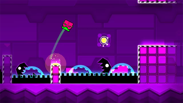 游戏的核心是点击屏幕让方块跳跃。面对不同障碍,策略也不同:
