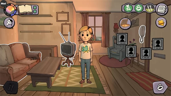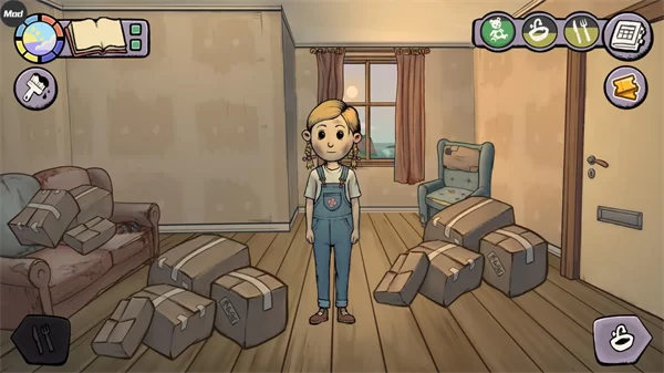 屏幕右上角显示的三项关键指标需要特别关注:娱乐值(笑脸图标)、干净值(水滴图标)和饥饿值(食物图标)。当任何一项指标显示红色时,需要立即采取相应措施。同时,左上角的时间显示提醒你合理安排每日活动,确保孩子在适当时间上床休息。