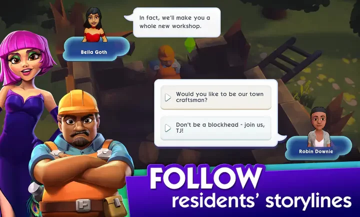 选择角色并探索城镇:根据提供的角色列表,挑选你喜欢的模拟市民,如贝拉或鲍勃,开始探索任务。完成建造目标,解锁新物品和场地,扩大城镇规模。