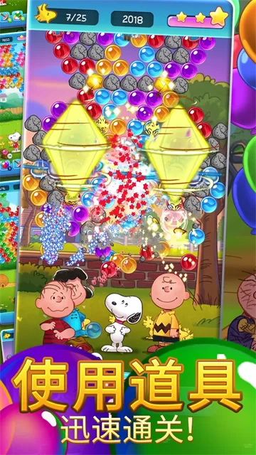 史努比泡泡中文版并非简单的泡泡龙复刻,它在经典框架中注入了独特的灵魂。游戏的核心玩法是经典的瞄准发射消除,你需要滑动屏幕,精准地将彩色泡泡射向顶部的泡泡群,连接三个或以上同色泡泡即可消除。然而,游戏的巧妙之处在于其丰富的关卡目标和障碍设计。