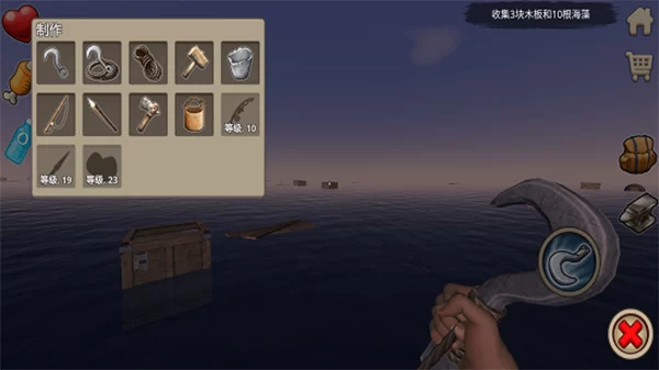 - 资源收集是根基:游戏初期,你唯一的工具就是那把至关重要的钩子。用它来钩取海上漂流的木板、塑料、棕榈叶等基础物资。这是你扩建木筏、制造工具的生命线。