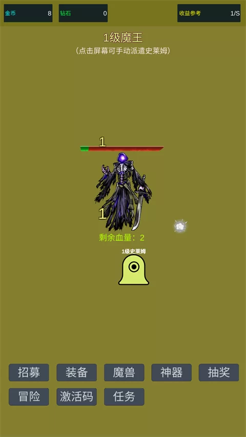 图示:简约直观的战斗界面,史莱姆正自动攻击魔王,玩家可随时手动点击增援。