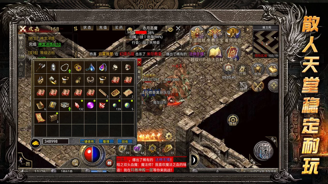 - 极致的爆率与打金体验:游戏彻底打破了传统传奇“装备难求”的设定,全面开放所有装备的爆率。从初级小怪到世界BOSS,都有机会掉落稀有装备和顶级神器。特别是击杀BOSS时,满屏光柱的爆装效果,能带来无与伦比的成就感和实实在在的财富积累。