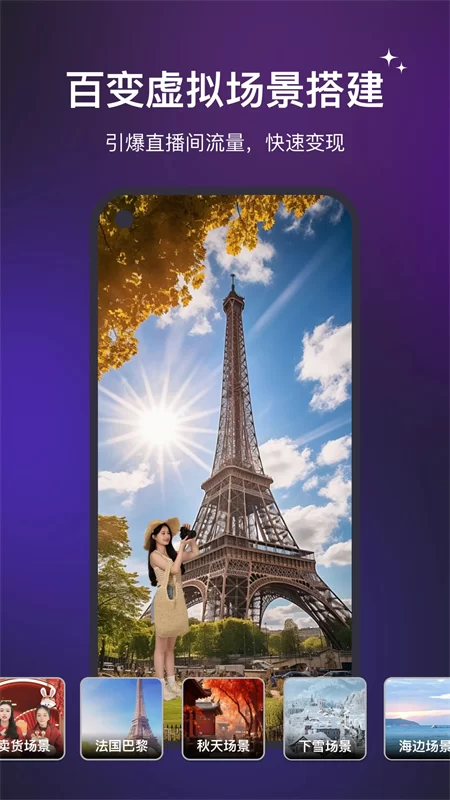 - 智能虚拟背景与绿幕功能:这是软件的立身之本。它内置了上千种静态背景、动态视频背景以及氛围音效,从简洁的纯色到炫酷的科幻场景应有尽有。最值得一提的是其“无需绿幕”技术,通过AI智能抠像,即使在没有物理绿布的环境下,也能实现较为干净的背景替换,大大降低了直播门槛。