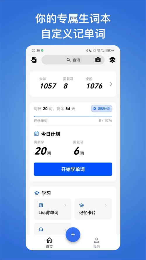 图示:生词本app主界面清晰展示学习进度与统计概览。