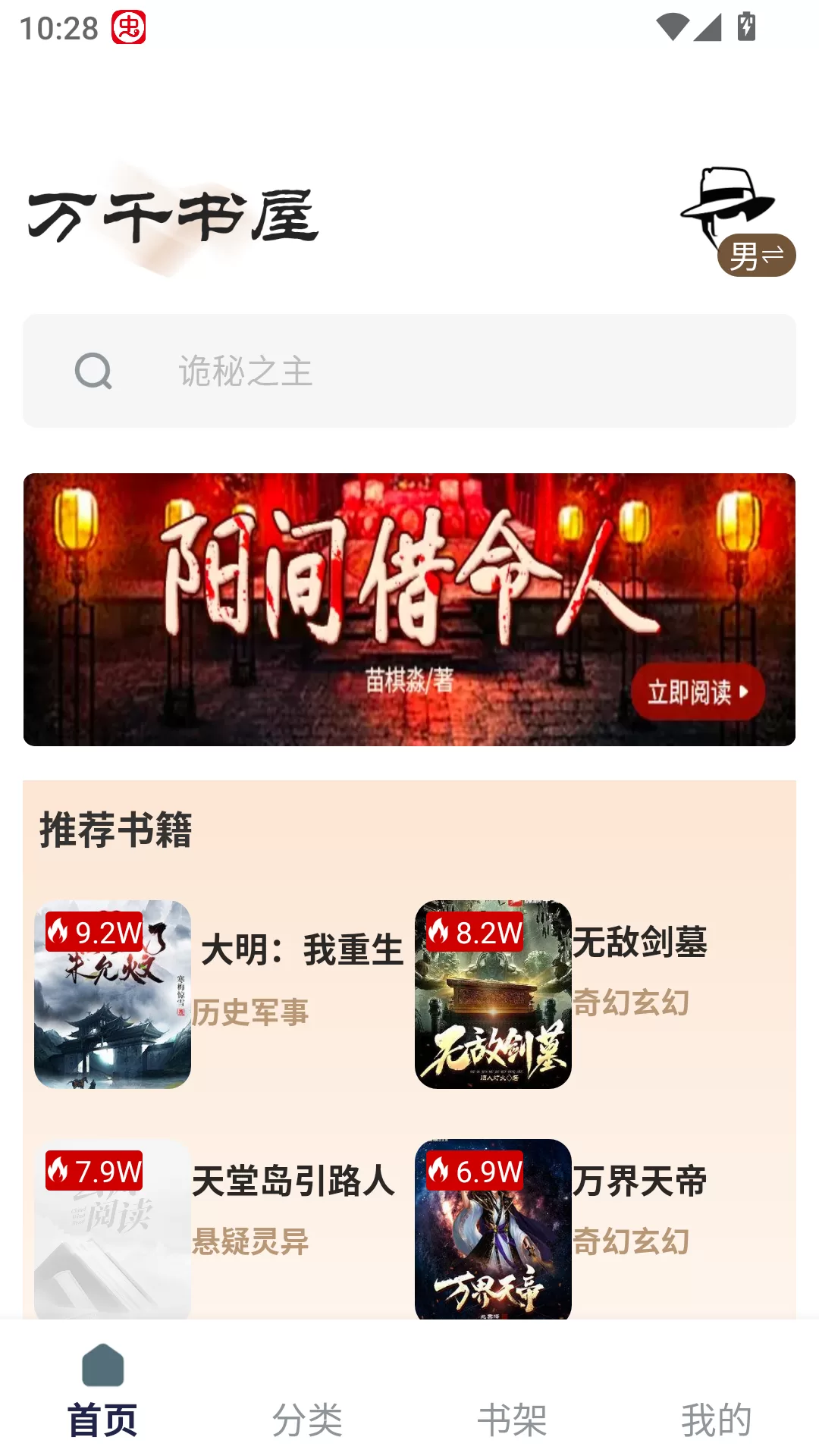 图示:旷野书屋最新版首页,各类免费小说一目了然,界面干净无广告。