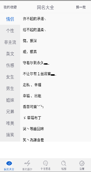 - 第一步:按图索骥,浏览分类。打开APP后,首页清晰展示了各种分类标签。直接点击你感兴趣的类型,如“情侣网名”或“搞笑签名”,海量精选素材便会呈现在眼前。