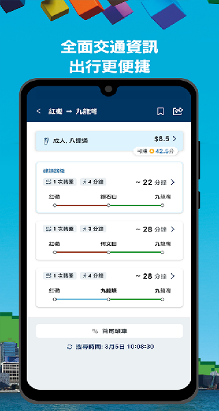 - 智能行程规划与多元搜索:除了输入站名,您还可以使用地标(如“尖沙咀钟楼”、“太古广场”)作为目的地,APP会自动规划包含站内外步行路径的最优方案。它支持语音输入,并能一次性推荐多达3种换乘方案,详细比较时间与路径,满足不同需求。