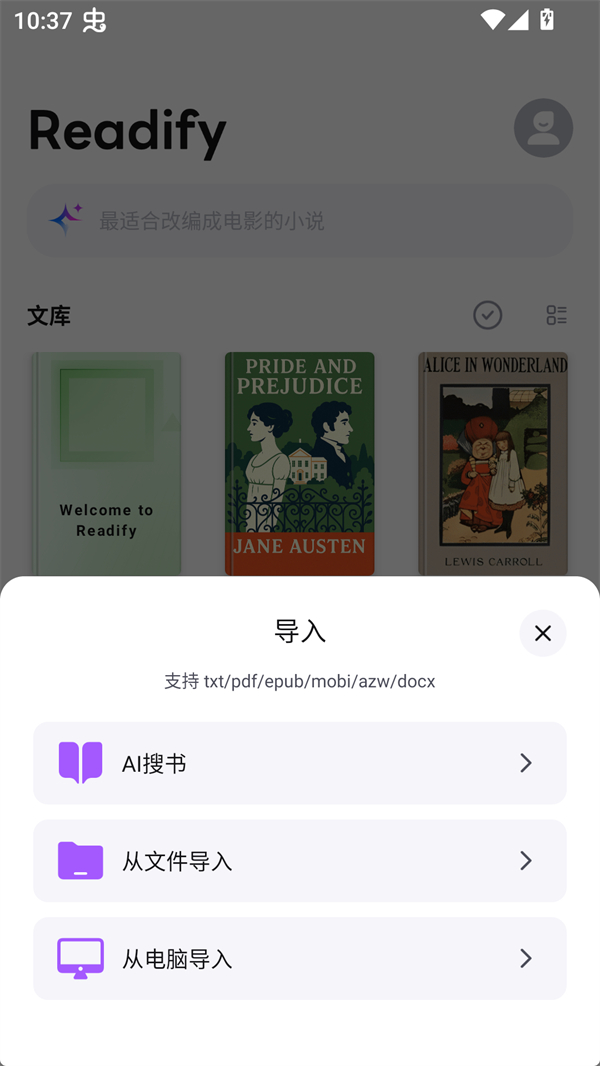 - 全格式文档支持,打破格式壁垒:无论是小说爱好者收藏的EPUB、TXT,还是工作学习中的PDF、MOBI文档,都可以直接上传至Readify悦读app。它还能智能处理复杂排版的PDF文件,将其转换为易于收听和阅读的格式。