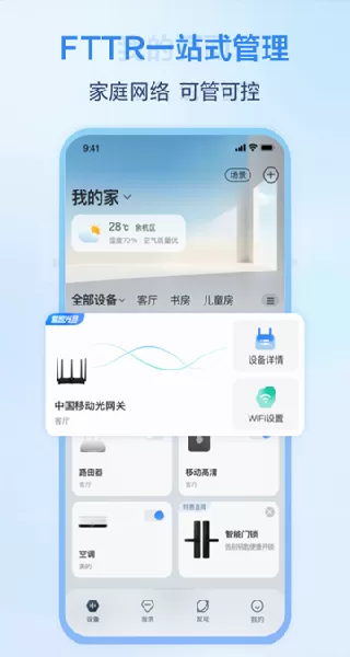 - 一站式网络与设备管理:软件深度整合了家庭智能网关的管理功能。用户无需专业知识,即可在APP内完成网关一键绑定、Wi-Fi网络优化、带宽分配甚至绿色上网设置,极大优化了家庭网络环境,让智能设备运行更稳定。