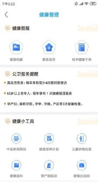 - 个性化的健康管理工具箱:APP内置了丰富的健康管理工具,如中医体质辨识,帮助您了解自身体质并获取养生建议;母子健康手册,记录孕期与儿童成长的关键数据;疫苗接种计划提醒,确保家人按时完成接种。这些工具让健康管理变得更加科学和个性化。