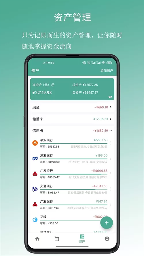 除了记录流水,你还可以添加银行卡、信用卡、债务等资产账户。软件能自动计算债务还款计划并提供日历提醒,避免逾期。资产净值与账户余额趋势一目了然,让你全面掌控个人资产负债表。