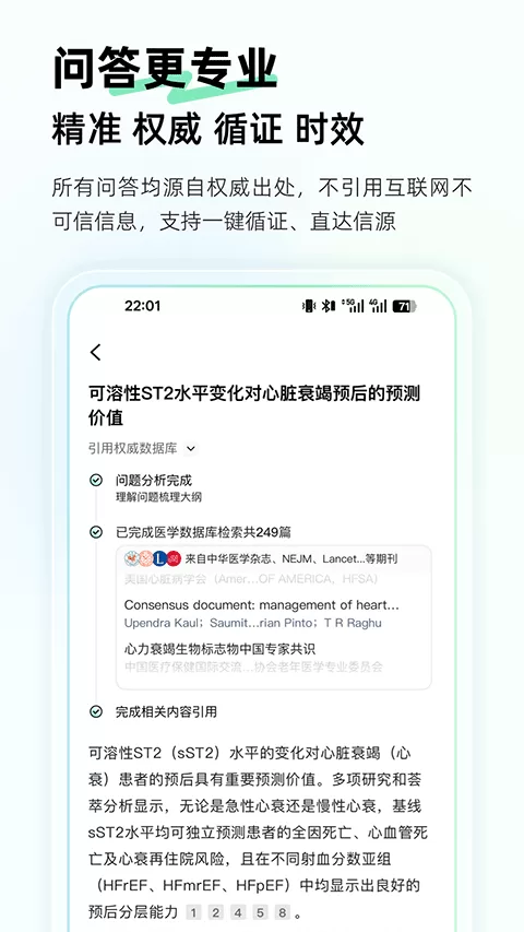 首先,其智能循证问答系统堪称一绝。用户只需用自然语言输入临床问题,AI引擎便会从超过千万篇医学期刊和国内外临床指南中,提取最相关、最权威的证据生成回答。每一个结论都标注了明确的文献来源,支持一键溯源,彻底杜绝了网络不实信息的干扰,确保了信息的精准与可靠。