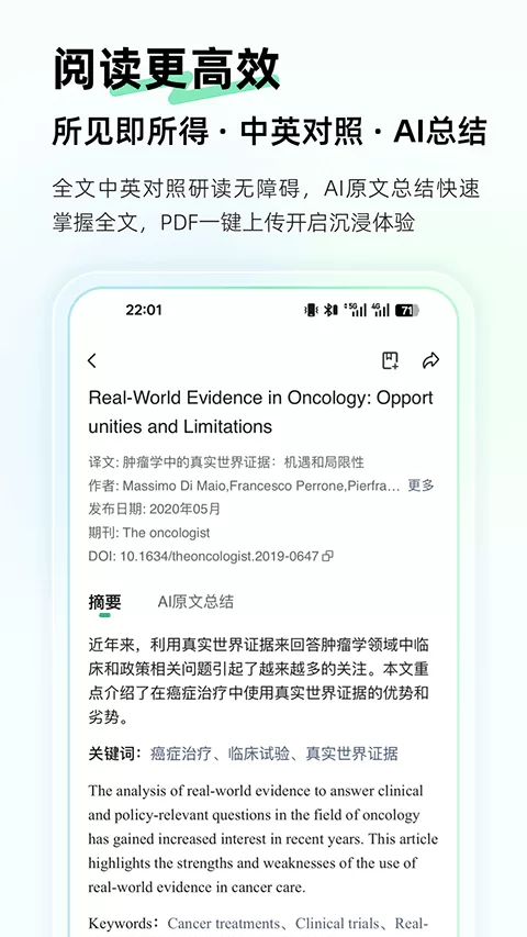 最后,其沉浸式阅读与知识管理功能也尤为出色。上传PDF文献后,app可提供全文中英对照、AI智能总结和重点划取,帮助用户快速把握文献核心,将阅读效率提升数倍。