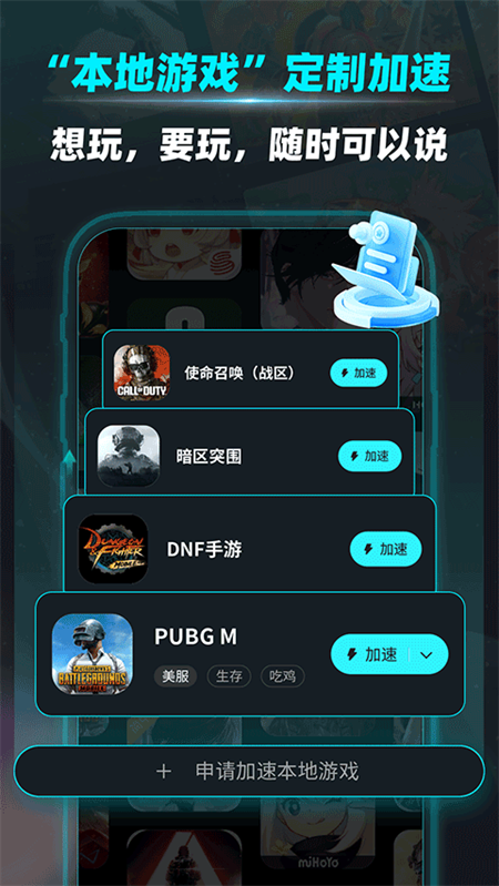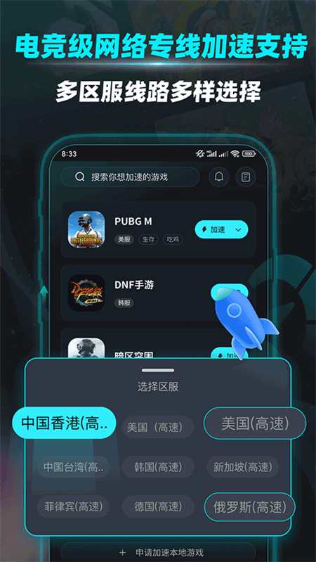 图示:在疾风加速器内选择你想要加速的游戏,如《碧蓝档案》或《绝地求生2》。