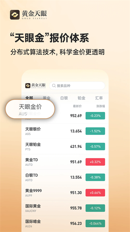 图示:黄金天眼APP官方正版首页,清晰展示黄金、白银等贵金属的实时行情。