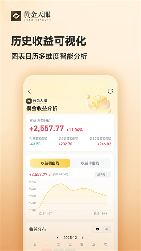 - 智能资产账本与可视化分析:软件内置智能黄金账本,自动记录用户的每一笔持仓与盈亏,无需手动繁琐记账。独特的“攒金日历”功能,支持从年、月、日多维度可视化呈现历史收益曲线与资产变化,让你的投资成果一目了然,助力进行更科学的复盘与规划。