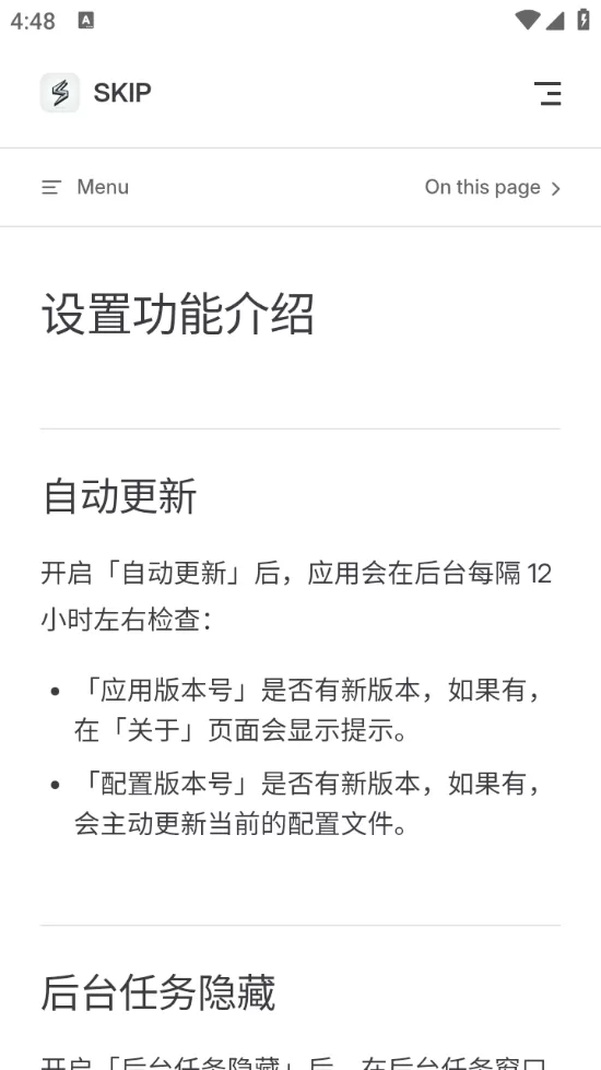 在正常使用下,SKIP的资源占用极低,几乎不会感知到其对电量和性能的影响。确保在设置中开启“应用保活”,可以避免因系统清理后台导致功能失效。