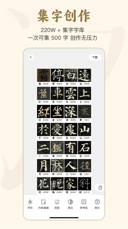 - 集字与创作工具:这是一个极具特色的功能。你可以从不同碑帖中选取单字,自由组合成对联、诗句或任何内容,并能一键统一书写风格,轻松完成属于自己的书法作品创作。