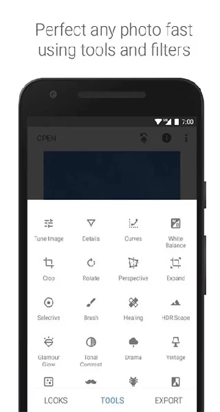 Snapseed手机版的功能模块清晰,主要分为“工具”和“滤镜”两大类。工具用于精细调整,滤镜用于快速风格化。