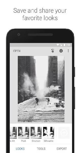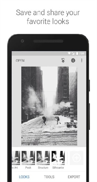 Snapseed手机版主界面,设计简洁,功能分区明确。