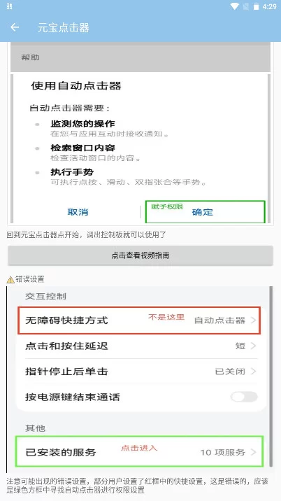 - 在无障碍服务列表中找到「元宝点击器」,并开启其服务开关。