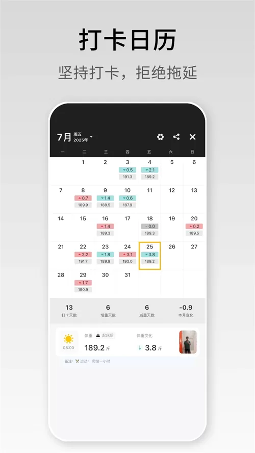 - 数据查看与管理:记录完成后,数据会立即显示在主界面和日历中。您可以随时点击查看详情,或通过左右滑动切换不同的数据视图(如体重趋势图、围度变化图)。