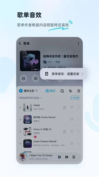 - 懂你的音乐推荐:应用独创的“音乐DNA”推荐系统,会通过你播放、收藏、分享的歌曲智能分析你的喜好,每日为你生成个性化的“每日推荐”和“雷达歌单”,不断发现你可能喜欢的新音乐,彻底告别歌荒。