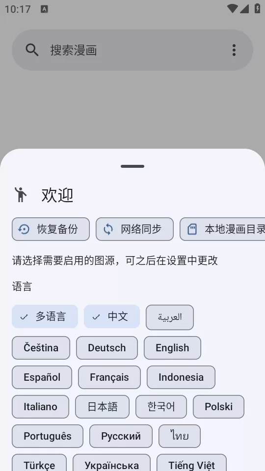 图示:Kotatsu漫画阅读器简洁明了的主界面和初始设置选项。