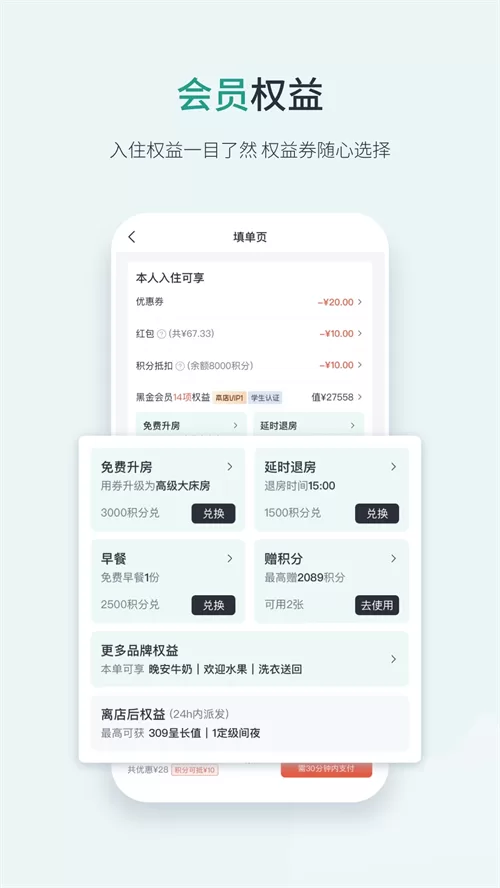 - 丰富权益:会员还可专享免费早餐、房型升级、延迟退房、洗衣送回、晚安牛奶等贴心权益,参与“住N送1”等活动,享受折上折优惠。