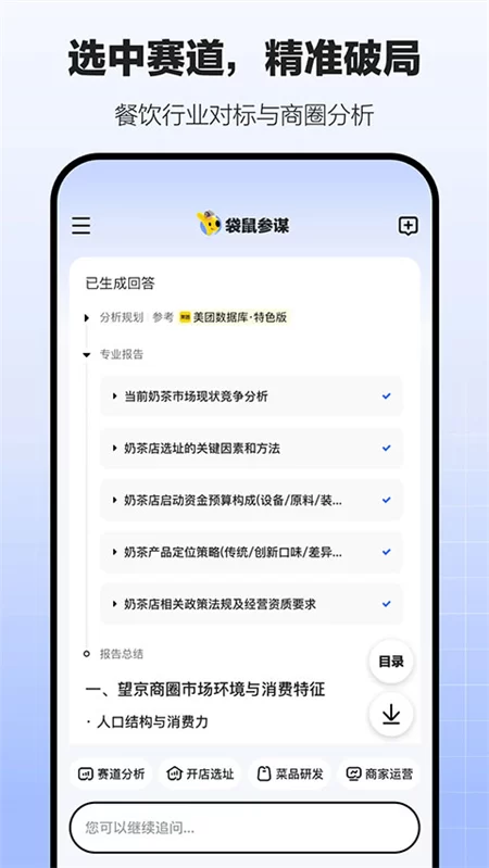 在餐饮行业竞争日益激烈的今天,无论是准备入局的新手,还是寻求突破的资深商家,都渴望拥有一个能洞察市场、指导决策的“军师”。袋鼠参谋APP正是这样一款由美团官方推出的AI智能决策工具。它深度整合了海量商家数据与消费行为,并依托强大的“Longcat龙猫”大模型,为餐饮从业者提供从赛道分析、智能选址到菜品研发、运营优化的一站式数据解决方案。本文将为您详细介绍这款APP的核心功能、使用方法和独特价值,助您轻松完成袋鼠参谋app官方下载,用数据驱动生意增长。