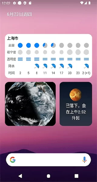 晴天钟APP主界面,集成了天气与天文关键信息。
