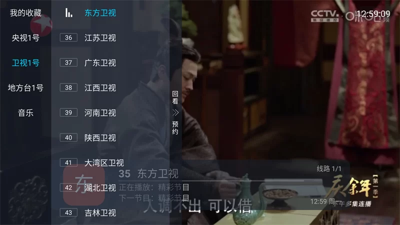 图示:在频道选择页面,可以轻松浏览并切换至央视、卫视等不同分类下的具体频道。