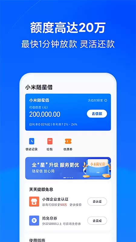 - 便捷信贷服务:“随星借”模块提供了高效透明的借贷服务。用户可申请最高20万的额度,体验最快1分钟到账的极速放款。利率公开透明,日利率低至0.02%起,旨在满足用户应急周转需求,同时倡导理性借贷、按需借款的健康消费观念。
