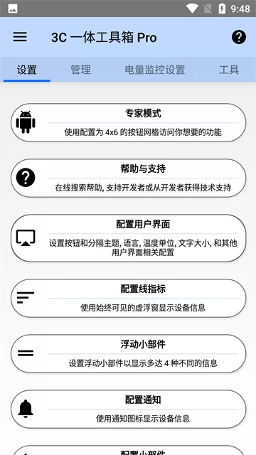 - 初识界面:安装并打开3C一体工具箱专业版最新版,主界面简洁地分为“设置、管理、电量、工具”四大板块,所有高级功能都藏于其中。
