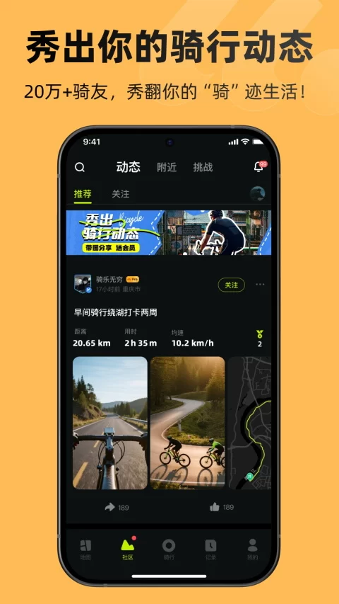 - 激励性挑战与成就社区:内置丰富的挑战任务和勋章成就系统,定期更新主题挑战。完成挑战不仅能获得虚拟荣誉,更能激发持续骑行的动力。你还可以在动态社区中分享成就、路线和热力图,与全国骑友互动。