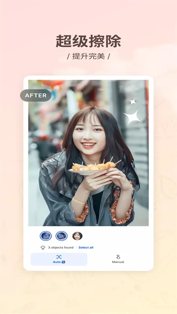- 导入与智能识别:打开应用,从相册中选择需要编辑的照片。以一张带有杂乱背景的旅游照为例,点击“消除”功能,AI会自动检测并高亮显示除主体外的干扰物(如其他游客)。