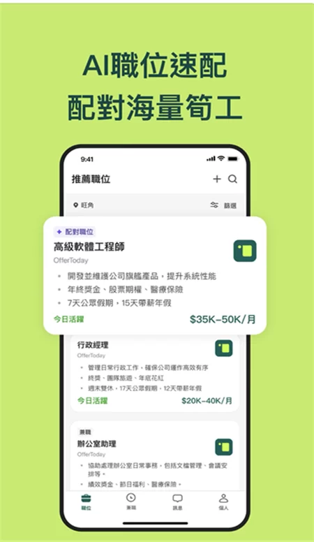 想要在香港找到理想工作?OfferToday香港直聘APP是您的最佳选择!作为BOSS直聘旗下专为香港求职者打造的专业平台,这款软件汇集了金融、科技、服务业等各行业的优质岗位。无论您是寻找兼职还是全职工作,都能通过智能AI匹配系统快速找到心仪职位。支持多语言界面和社交账号一键登录,让求职过程更加便捷高效。接下来,让我们深入了解这款求职神器的特色功能和使用技巧。