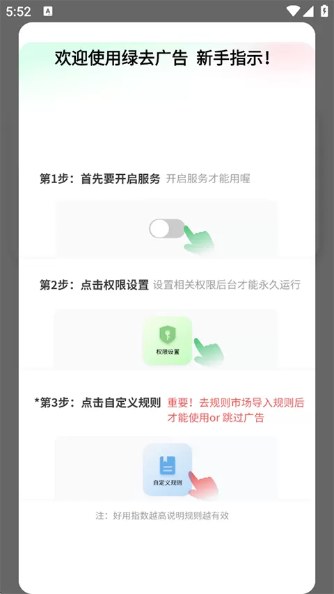 安装并打开绿去广告APP,在主界面找到并点击“开启服务”或类似的按钮,启动广告过滤引擎。