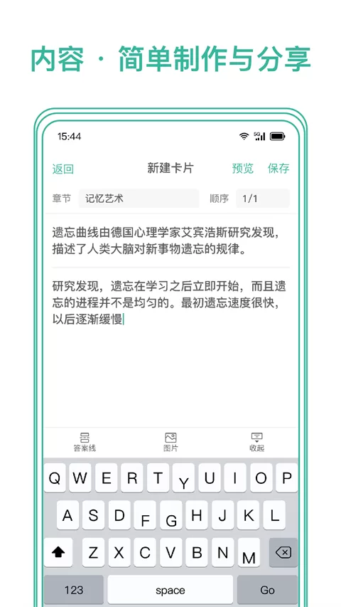 - 个性化知识卡片创建:你可以将任何需要记忆的内容——无论是复杂的公式、外语单词还是专业术语——制作成专属记忆卡片。支持文字与图片混合编辑,让知识点呈现更直观、更易于理解。