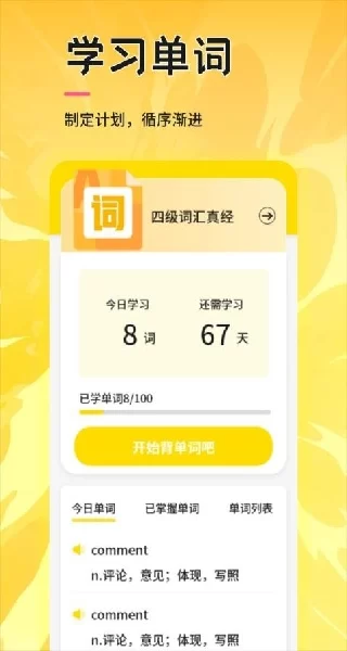 打开APP后,你可以首先设定自己的学习目标(如30天掌握考研核心词)和每日学习量。系统会根据你的选择,自动生成一份专属的学习日历,明确每天的任务,帮助你养成持之以恒的学习习惯。