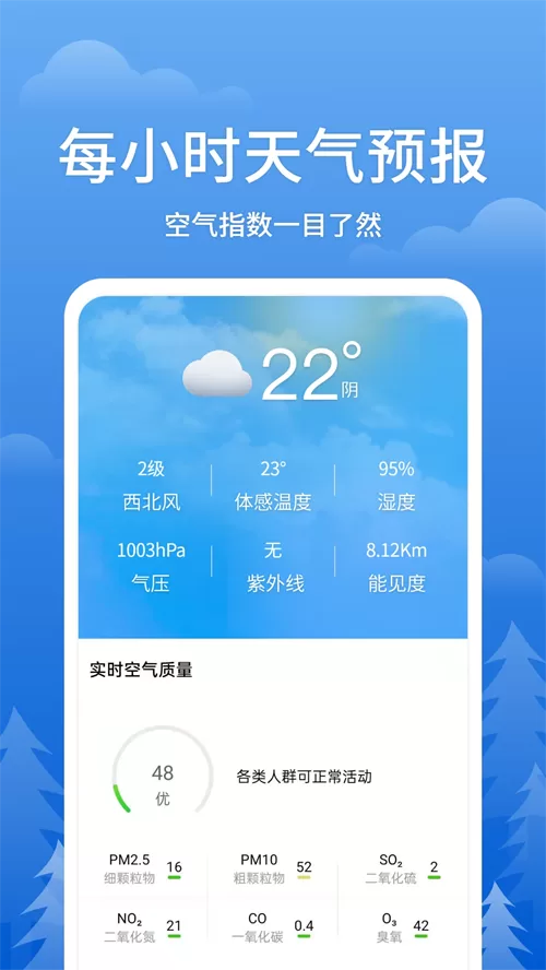 - 初始设置与快速概览:首次打开APP,它会自动定位你的城市。首页顶部醒目地展示当前气温、天气状况和体感温度,下方是未来几小时的精确预报,让你瞬间掌握天气全局。