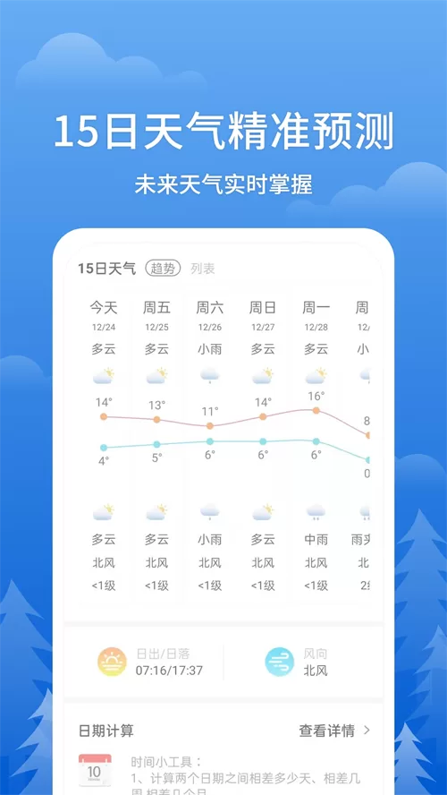 - 深入查看详细预报:向下滑动屏幕,你可以查看未来24小时每小时的天气变化(包括降水概率和风速),以及未来7天甚至更长时间的天气预报。这是规划次日穿搭或一周行程的关键。