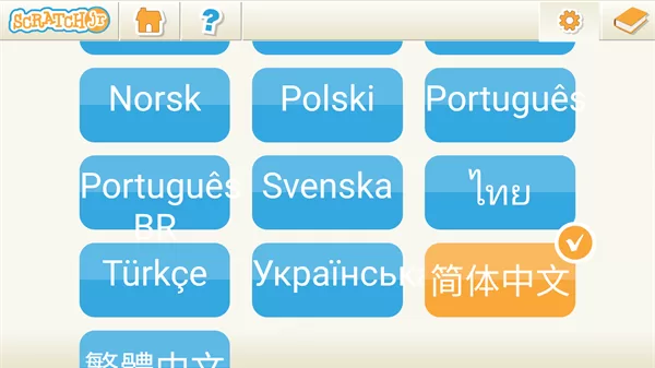 打开ScratchJr应用,你会看到一个充满童趣的主页。为了更方便使用,第一步建议先设置语言。点击右上角的齿轮状设置图标,在语言选项中找到并选择“中文(简体)”。