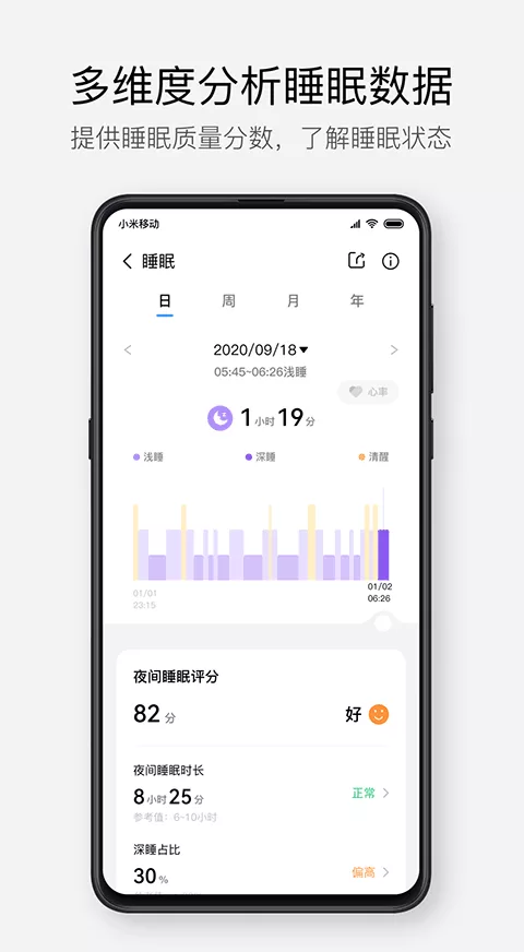 - 多维睡眠分析:睡眠监测不仅记录时长,更采用科学的评分体系,从日、周、月、年多个维度进行分析,帮助你直观了解睡眠质量的长期变化。